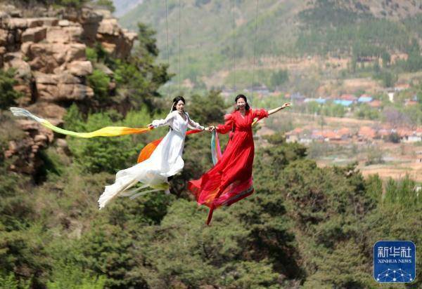4月16日,游客在沂南县红石寨景区体验高空威亚项目。