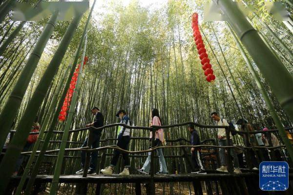 4月16日,游客在沂南县铜井镇竹泉村竹林中游玩。