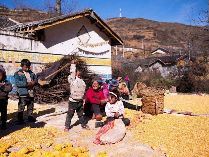 2017年12月21日,凉山州金阳县依达养护站附近 玉米收下来之后,要脱粒。这是一件费时费力的劳作。一般都是由妇女手工掰搓,也有装在袋子里用木棍捶打敲砸的。一个小男孩正使足全身气力举起了棍棒,在一旁的妈妈看着他,比吃了啥、喝了啥都要高兴。