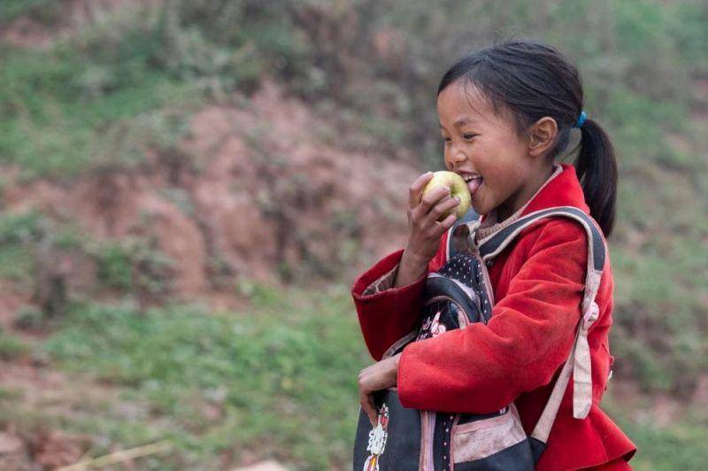 2016年10月28日,凉山州昭觉县洒拉地坡乡一年级的小女孩阿都日格放学了。她从书包里拿出了一个苹果。苹果是甜的,她舔到了,虽然还隔着一层苹果皮。那是被夏日的太阳晒透了,被秋天的风吹红了的甜。和得了老师的夸奖,得了一个小红星一样,她从心里感觉到了这一种甜。
