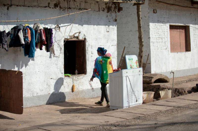 2017年12月21日,凉山州昭觉县日哈乡公路边房子虽然算不上簇新,但新的生活习惯已在逐渐形成。过去所说的什么“一辈子洗不上几次澡,换不了几身衣服”,已经成为历史。洗衣机已不是稀罕东西。