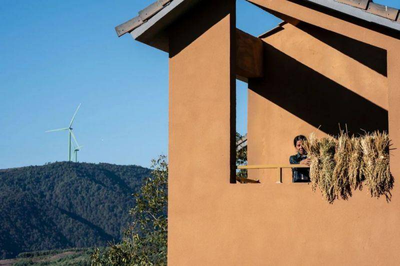 2021年10月28日,凉山州昭觉县解放乡大石头村一片新房子,色彩、样式都很时尚。才一年多没来,变化之大之快真是令人不可思议。沙且日各今天来她儿子这里,帮忙收拾收拾家里。说话间她就进屋上了二楼阳台,一面大声和我们聊天,一面整理着晾晒在阳台上的庄稼。附近的山坡上是一片新安装上的风力发电机。叶翅不紧不慢地转着,生活中的一切正在有条不紊地不停变化着。