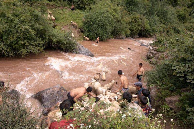 2019年8月1日,凉山州金阳县丙底乡雨后涨了水,小溪变成了一条湍急的河流。彝族小伙子们正齐心协力,想把羊群赶到对岸去,因为那里的草更丰美。他们齐声唱着《不要怕》:不管水多深,不要怕, 不管路多远,不要怕, 不要怕,不要怕,我们的日子更美好。