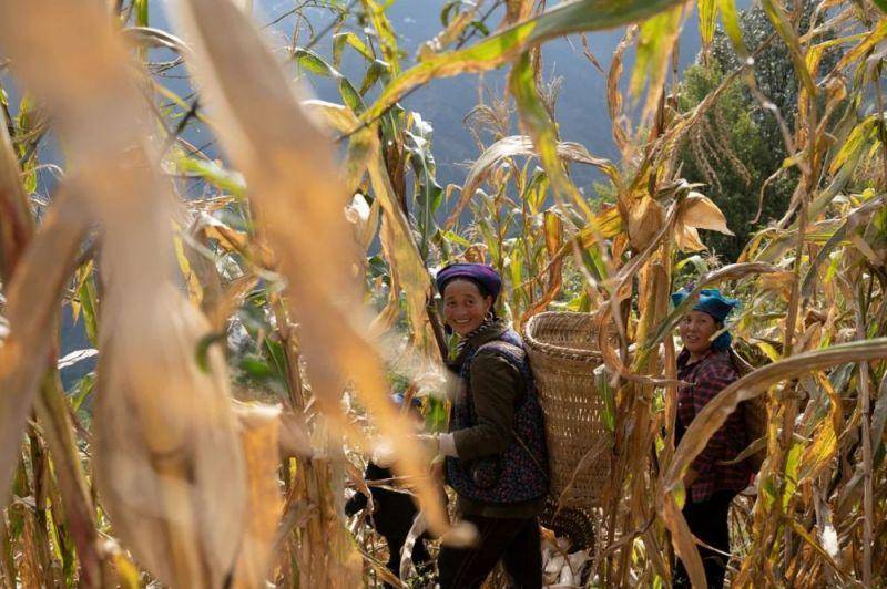 2021年10月26日,凉山州金阳县沙马村 从芦稿镇28道湾下山,路过沙马村,一群彝族妇女在山坡上收苞米。和她们打趣道:“辛苦了。老公也不来帮帮忙?”,一个能说会道的妇女抢着回答说,“他马上就来,把苞米背回去”。果然一会儿她丈夫就来了。我们还相互留了电话。她开心地笑了。