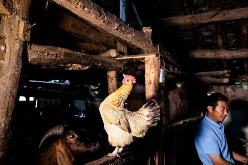 2019年7月21日,巴中南江县下两镇瓦坪村在农户彭新昌家老房子的羊圈里。一只鸡既不怕人,也不怕黄羊,它跑进羊圈,跳到高处扯着嗓子叫开了。估计是吃饱了,喝足了。