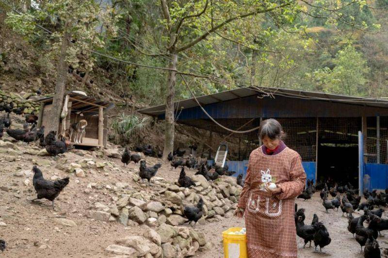 2021年11月1日,巴中南江县光雾山镇槐树村陈明贵(女)今年65岁了。儿子患有尿毒症,每周要去县医院做三次透析,家中原来生活十分困难。近两年通过帮扶,她们养了3000只黑鸡,日子好过多了。她一边捡拾着黑鸡刚下的蛋,一边说“黑鸡蛋味道好,营养好”,“你们城里人都喜欢吃的”。