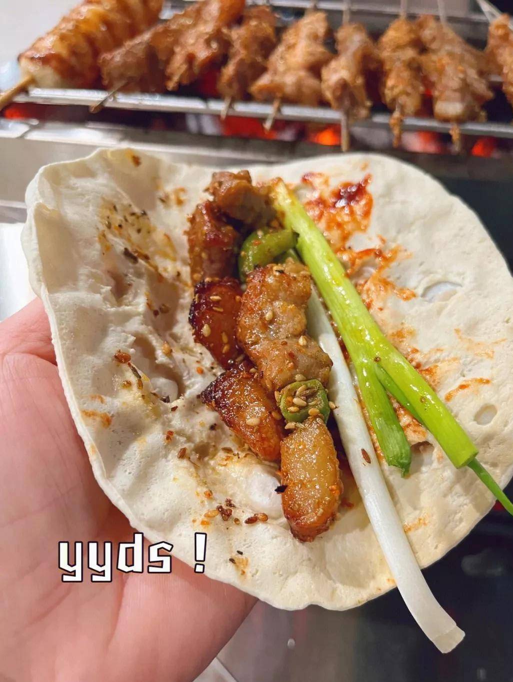 在这里,“小饼卷一切”,食客们平铺小饼,加上小葱和肉串,三位一体,一口下去,口感丰富,这正是淄博烧烤的过人之处,不同于其他烧烤的食用方式。
