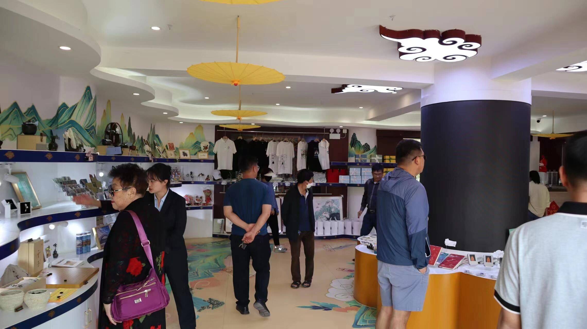 步入礼遇官渡文创店,一股绿色小清新风奔来眼底,吊顶及展柜大量使用了官渡八景元素,官渡八景系列冰箱贴、笔记本、优盘、公文包、晴雨伞、T恤等190多种,琳琅满目的文创产品让人应接不暇。店内设有文化创意产品展示区,咖啡吧,图书区以及休闲区域,可以拍照打卡,也可休闲办公。
