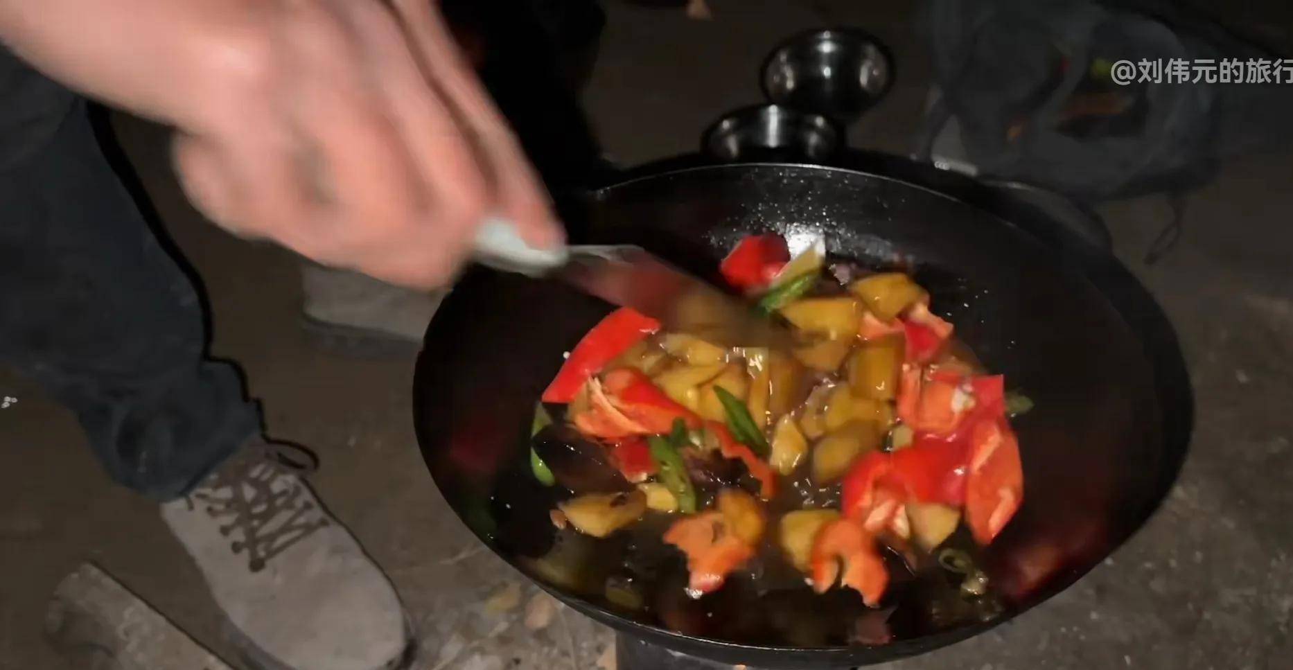 今天,伟元骑了夜路,以为到高速口会有吃饭的地方。结果啥也没有,只能在干涸的湖盆(也可能是河床)里搭帐篷,炒个辣椒土豆吃,看起来味道不错。