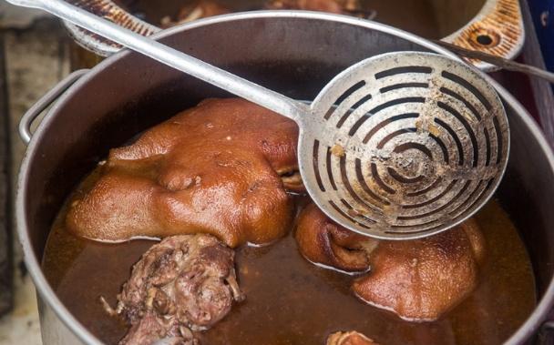 这对老夫妻卖的酥肉和一般的牛肉是不一样的,做法也是比较独特,大约煮上八成熟,最后再抹上一层蜂蜜,最后放到老汤捉细火慢炖,一直煮到酥烂为止,听老板说这个店已经有开了30年的时间了,这锅汤头也用了30年里边含有38味的中药,老板面前的这种大盆每天都要坐上四大盆,甚至还不够卖呢!
