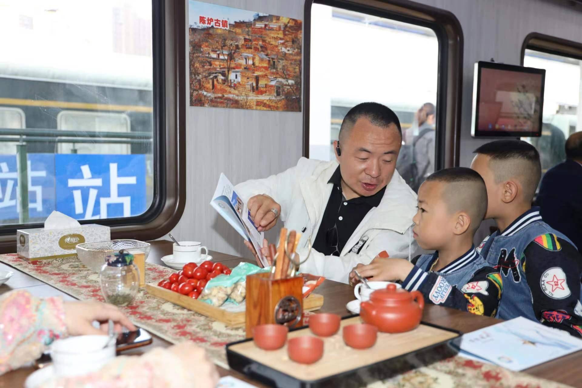 进入车厢,随处可见的“”铜川元素”令人眼前一亮,别致的耀瓷茶具、精美图册和文创产品令人在不经意间感受着铜川文旅的独特魅力,特色康养产品、旅游商品展销推介,倒吸壶、艾草枕等特色产品,更是吸睛无数。