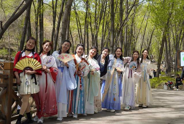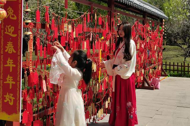 走在山间,树木成荫、鸟声鸣鸣、溪水潺潺,戏水打闹,好不欢快。伴着悠扬古乐,身着汉服的游人曲裾轻舞,或细步于长廊石阶回眸一笑,或轻倚在栏杆眺望远处,随手一拍尽显古风古韵,让来往游客深入探究传统文化的兴趣更加浓厚。