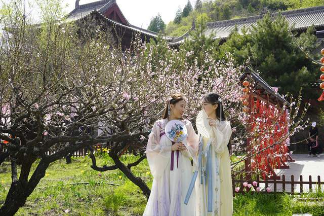 开化寺前,桃花灼灼、绿草茵茵,蜂蝶飞舞,“山寺桃花始盛开”的美景跃然眼前,吸引众多游客驻足。亲子游、研学游的游客随处可见,更有不少游人着汉服在桃花园赏花游玩、拍照打卡,不负良辰美景,使蒙山的春光更显灵动。