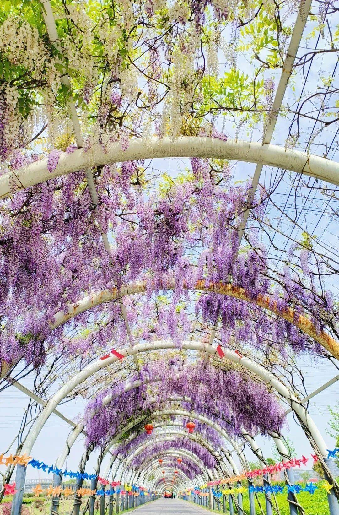 此外,百米长廊的紫藤花也慵懒地垂挂下来,随风飘动,似是在迎接每一位爱花者的到来。这其中,还藏着部分重瓣紫藤花,花瓣更密、色调更实,藏匿在大片的紫色之中,一样骄傲着展示自己独特的美。