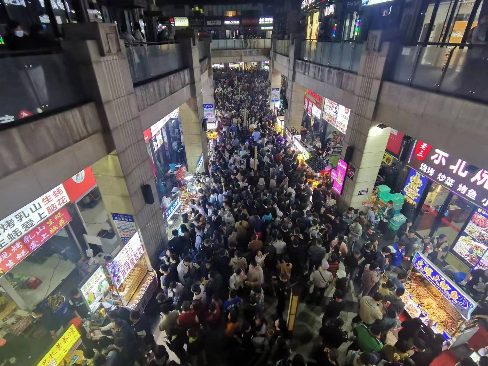 在泗泾三湘商业广场经营牛肉面近十年的韦振风有发言权。去年11月,在政府部门支持外摆经营,活跃“夜经济”的背景下,泗泾三湘商业广场商户自发形成夜市。“当时,受疫情影响,大家生意都不好,广场二楼空置率极高。”韦振风说,最艰难的时候,大家不约而同尝试摆摊引流。因为商业广场内街长约300米,宽达到近6米,有做夜市的基础。