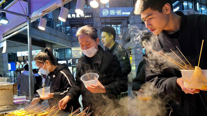 夜市繁荣与否,也关乎城市活力和吸引力。在泗泾夜市,打扮时尚的白领何倩与同事大快朵颐的同时,手里还拎着一袋袋打包好的小吃。“我们从深圳来松江出差,晚上想感受下上海的夜生活,上网搜索到泗泾夜市后,便从酒店打车过来了。”
