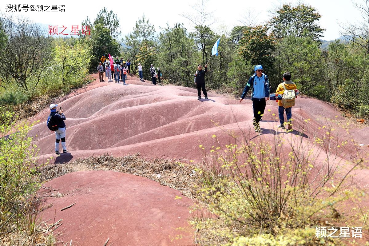 这是一片奇特的红砂岩石岭,周围的草木繁盛,唯独山丘之顶这一片,红砂裸露,成就了火焰山奇景,也是四明山上的一道奇特景观。