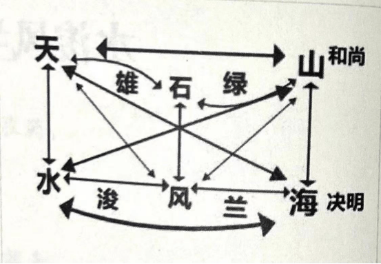 “天”对“水”,“雄”对“浚”,“天雄”对“水浚”,“石”对“风”,“绿”对“兰”,“石绿”对“风兰”;“山”对“海”,“和尚”对“决明”,“山和尚”对“海决明”。