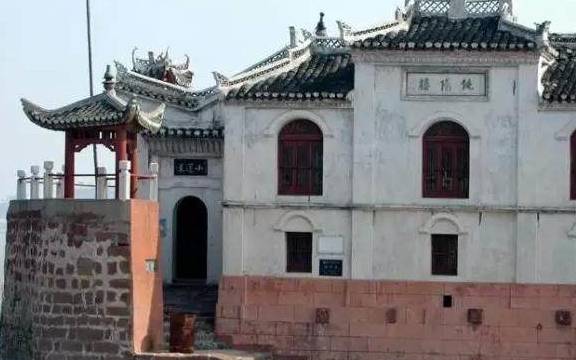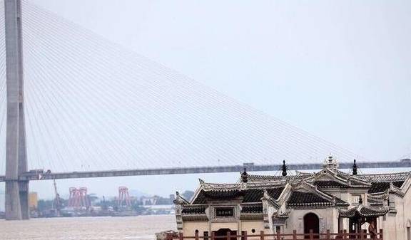 蟠龙石翘首西望,周身罩着一层氤氲烟气,犹如蜃景。而更为奇妙的是,一船形古阁突兀在龙首上,凌空虚悬,横江而峙。这便是令人叹为观止的鄂州观音阁。