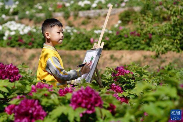 4月16日,小朋友在白台峪村牡丹农业产业园内写生。