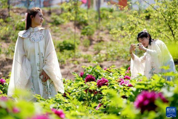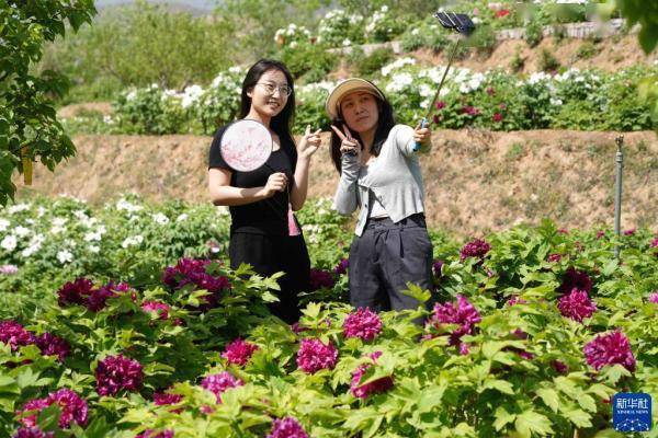 4月16日,游客在白台峪村牡丹农业产业园拍照游玩。