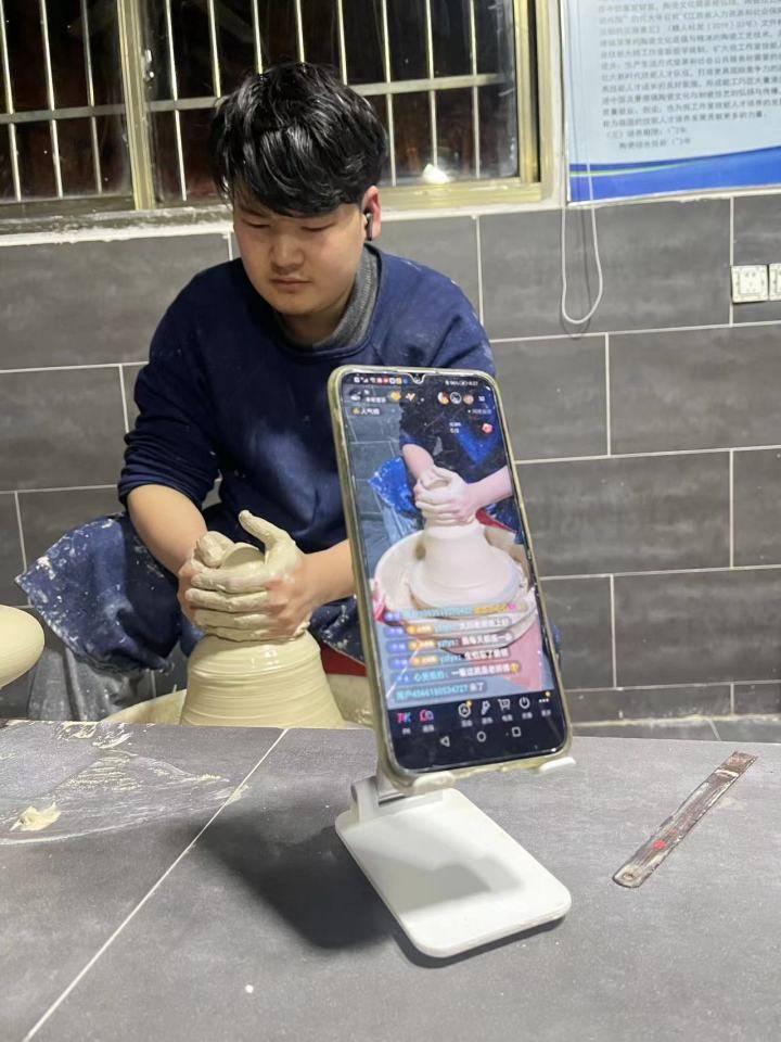 工作室的第一楼,徒弟们按照各自的进度设计造型、手工拉坯,晚上6点半,抖音直播准时开启,徒弟们在镜头前展示自己的手工拉坯技术,“占绍陶艺”帐号并不带货,这里更像是一间网课教室,为来自全国各地的淘吧工作人员、陶艺爱好者们讲解基本的陶艺知识。