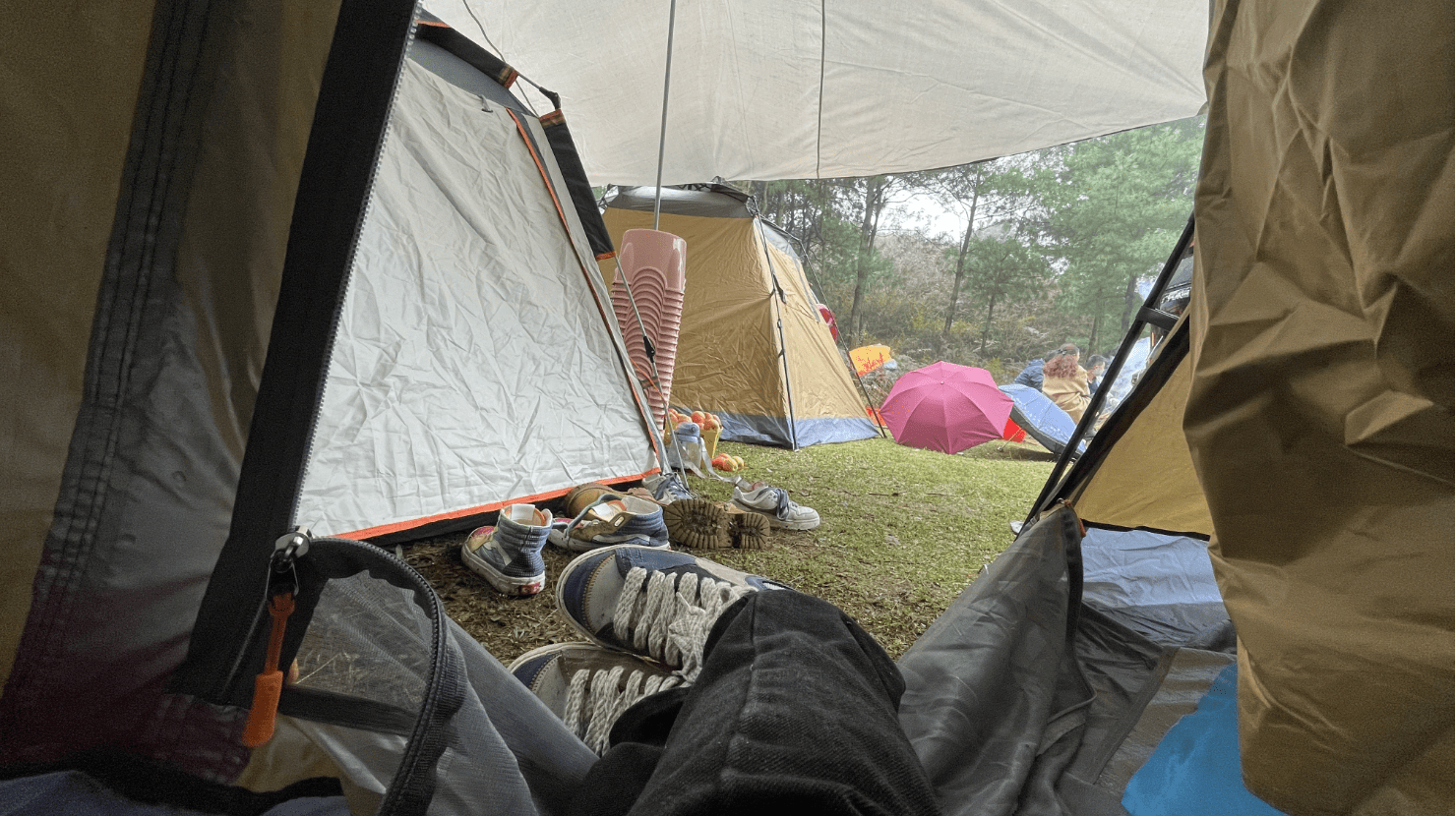 “啊,迷路了!”舅妈惊讶的表情,原来是处理完工作的舅舅也贪恋这世俗的美好,一下班,便马不停蹄的赶来,谁知迷失在这群山遍野中,由于舅舅的马虎,我紧随那三个叔叔,四处寻找舅舅,生怕舅舅开着车到处跑,找不着路。真是怕什么来什么,雨愈变大,山林中雨雾缭绕,我和叔叔们在小路上绕来绕去,车窗外的雨,让我忧心忡忡,终于在一个岔路口相遇,才大松一口气。晚上睡觉,我睡在舅舅和妹妹中间,这晚,彻夜难眠。有着十秒入睡技能的舅舅果然名不虚传,妹妹和舅舅的配合实在是打的好!一呼一应,此起彼伏,仿佛睡着觉也在交谈着在吃什么。雨滴拍打着帐篷,好像它也想参与其中。方圆十公里的野猪不敢拱我们的帐篷,因为野猪也怕这惊天的打呼声!