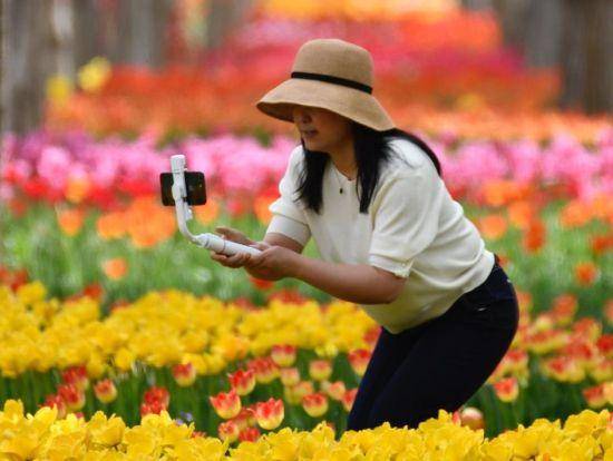 现场,永定河畔的绿色港湾被鲜花簇拥,56种100余万株郁金香争妍斗艳,牡丹、芍药、连翘等各式花卉竞相开放,游客徘徊其间宛如游弋在七彩花海。游客们沿着赏花步道,一路欢歌,向春而行,或漫步或留影,纵情于花丛间,欣赏着绚丽多彩的鲜花,感受着大自然带来的无限生机。