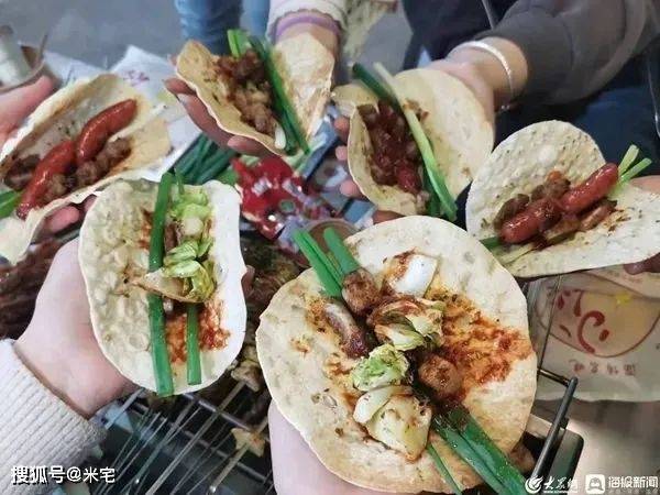 但淄博烧烤的灵魂在于,卷饼蘸酱配小葱,一个特别的北方吃法。