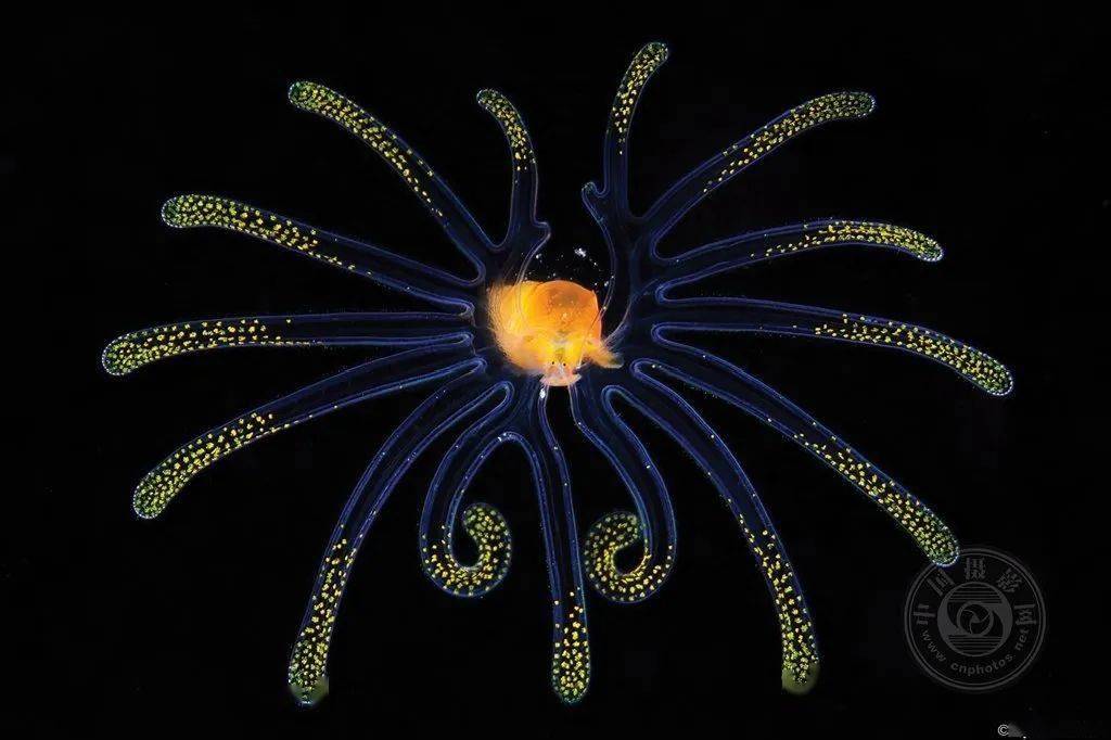 一种软体动物腹足动物幼虫,晚上在日本冲绳科米岛附近的海里遇到。它实际上非常小,事实上中间的海螺大小只有3mm,整体为20mm。海螺周围是一个叫做绒的游泳器官,内衬着纤毛。它是一种谨慎的生物,即使它们感到轻微的威胁,绒也会退到海螺中。这个物种的美丽让我想起了朱美拉棕榈,阿联酋美丽的风景之一。