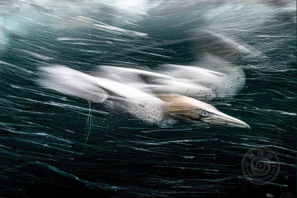 一只北方塘鹅在由潜水的海鸟创造的充满艺术感的泡泡冰雹中游泳。美丽的北方塘鹅过着双重生活。在巢中,它们小心翼翼地养育着新生的幼崽,当它们温柔地抚摸白色的脖子时,尖喙指向天空,从而加强了它们之间的感情。在飞行中,则进入了狩猎模式:锐利的黄色眼睛,带着蓝色的眼圈,在大海中搜寻猎物。它们长长的翼展和流线型的身体使飞行看起来毫不费力,只需要偶尔挥动翅膀就能滑翔。当鱼被发现时,塘鹅会迎风飞翔,张开翅膀作为刹车,根据猎物的位置精确地调整位置。这些神奇的鸟类在头部和胸部进化出了气囊,以在这种反复的沉重撞击中生存下来。从水下传来雷鸣般的声音,流线型的白色鱼雷穿透水面。我想为这些英俊的海鸟创造一个新奇的形象,并决心通过慢曝光来捕捉它们的运动。塘鹅的速度导致了无数的失败,但在这一帧中,我们保留了与塘鹅强烈的目光接触,即使场景被艺术地软化了。