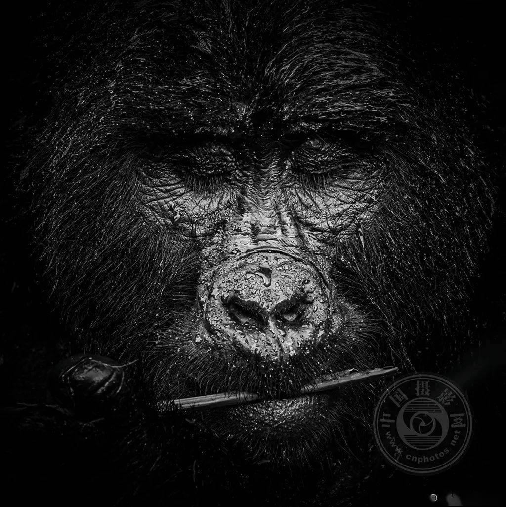基班德是一只来自乌干达鲁西古拉山地大猩猩家族的山地大猩猩,它正在雨滴下放松。水滴落在她脸上的样子和她嘴里叼着小木片的样子吸引了我的目光。