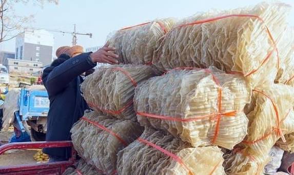 每年入冬之后,在山东大街上都能够看到一个透明颜色的特殊食物。不要问小编是怎么知道,因为几年前小编在山东旅游的时候就买回了不少。而且我们作为一个美食小编每天的任务自然就是为大家发现一些不一样的食物。当天小编独自走在外面的时候,发现了几位中年大妈正在一个三轮车前面挑选这什么,后来走进一看,才发现原来他们在买粉皮。最令人惊讶的时候我们买东西最多就是几斤几斤的称,可是这些大妈不一样,一提就是一大坨。于是小编带着自己心中疑问询问了一下,这才得知,这种食物是可遇不可求的,如果说现在遇上了不买的话,那么下一次就不知道是什么时候。