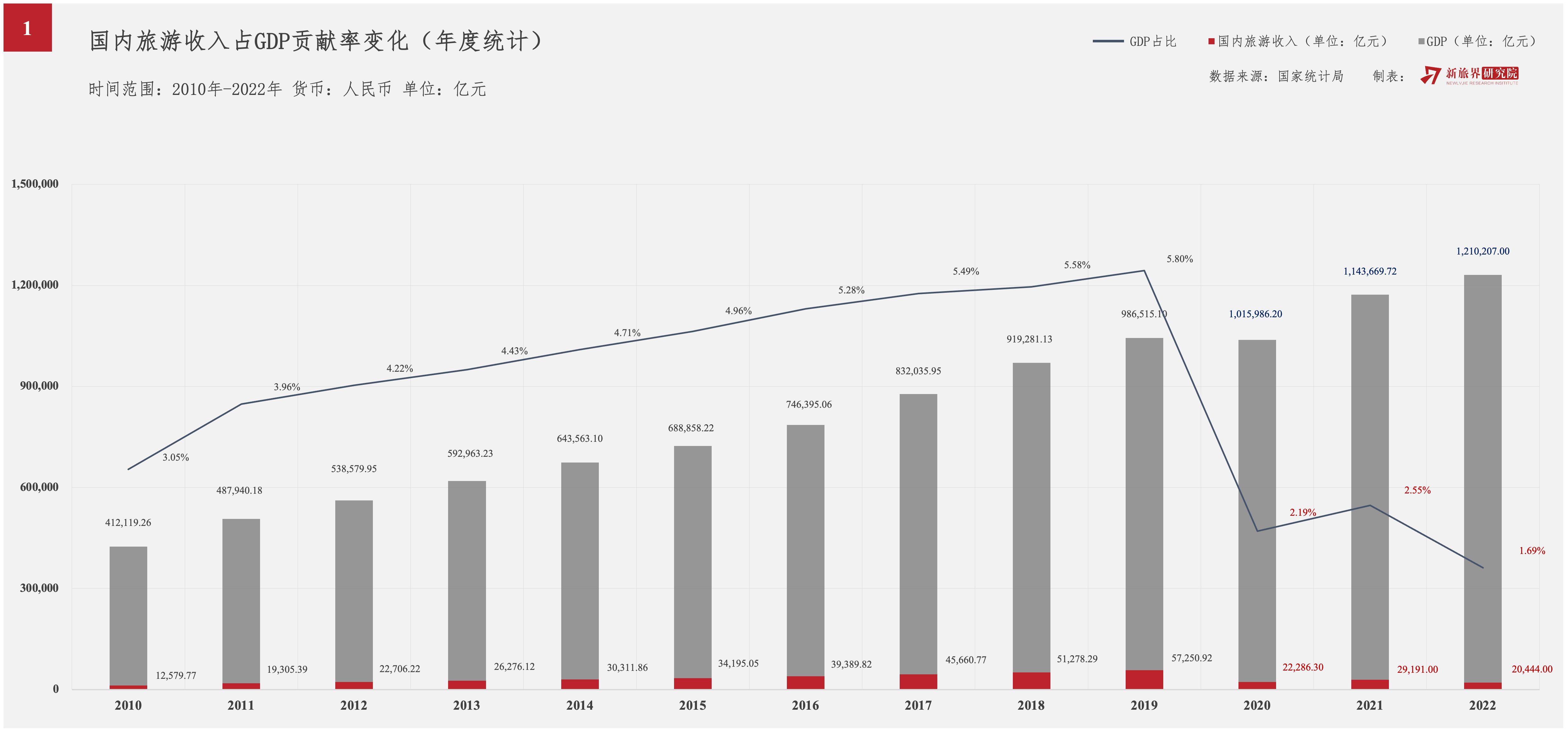 最近,国家统计局发布《2022年国民经济和社会发展统计公报》。公报显示,2022年全年国内游客25.3亿人次,国内旅游收入20444亿元,分别较上年下降22.1%和30%。国内旅游收入占全年GDP比重为1.69%,跌破2%,较2021年降低0.86个百分点,为疫情3年来最低。