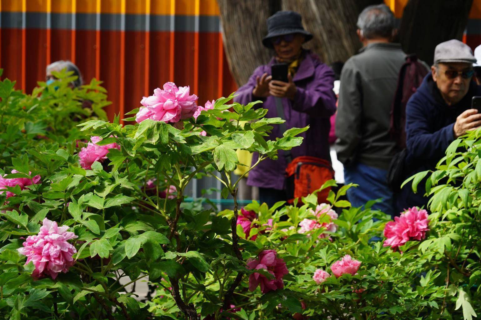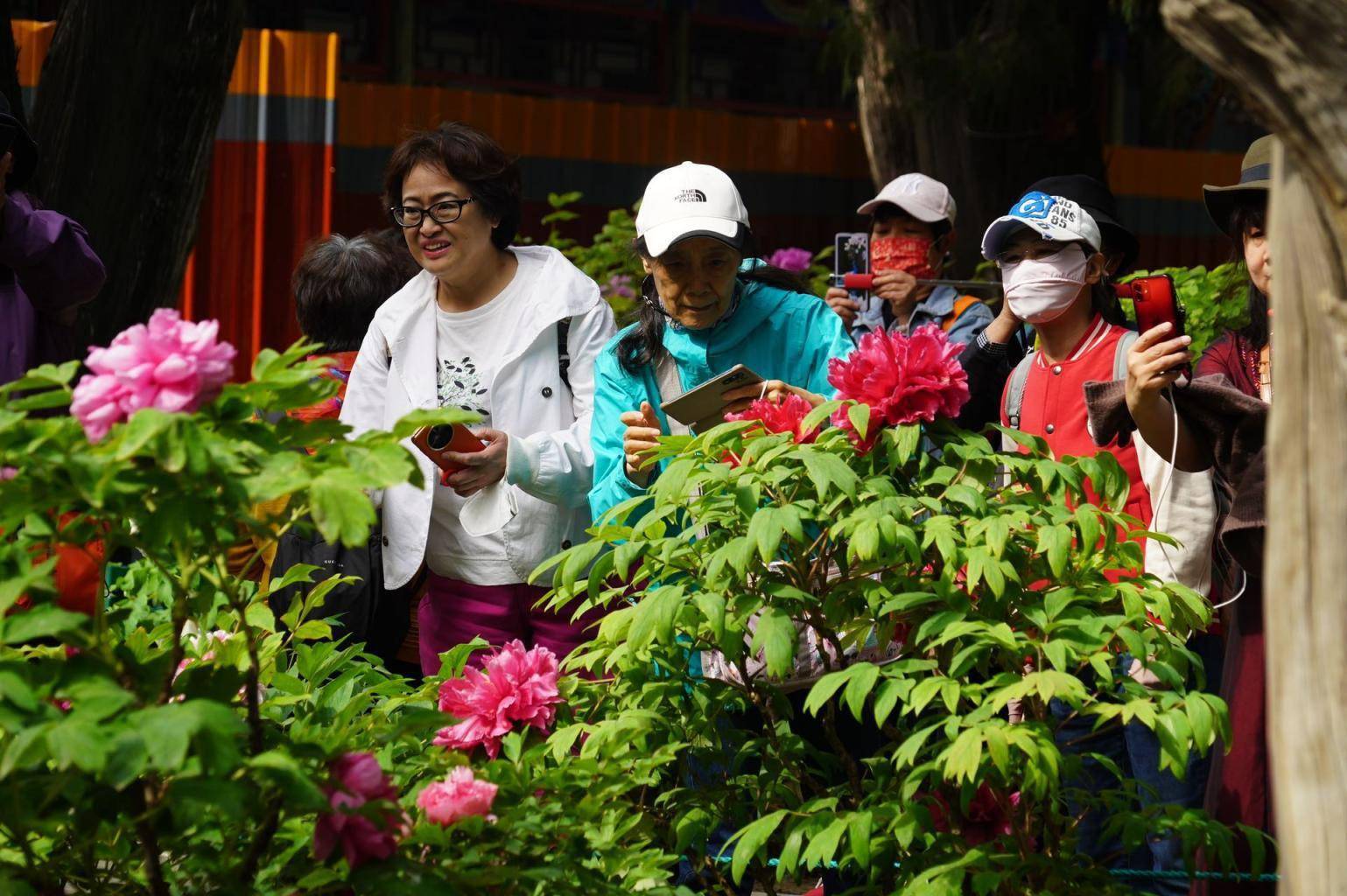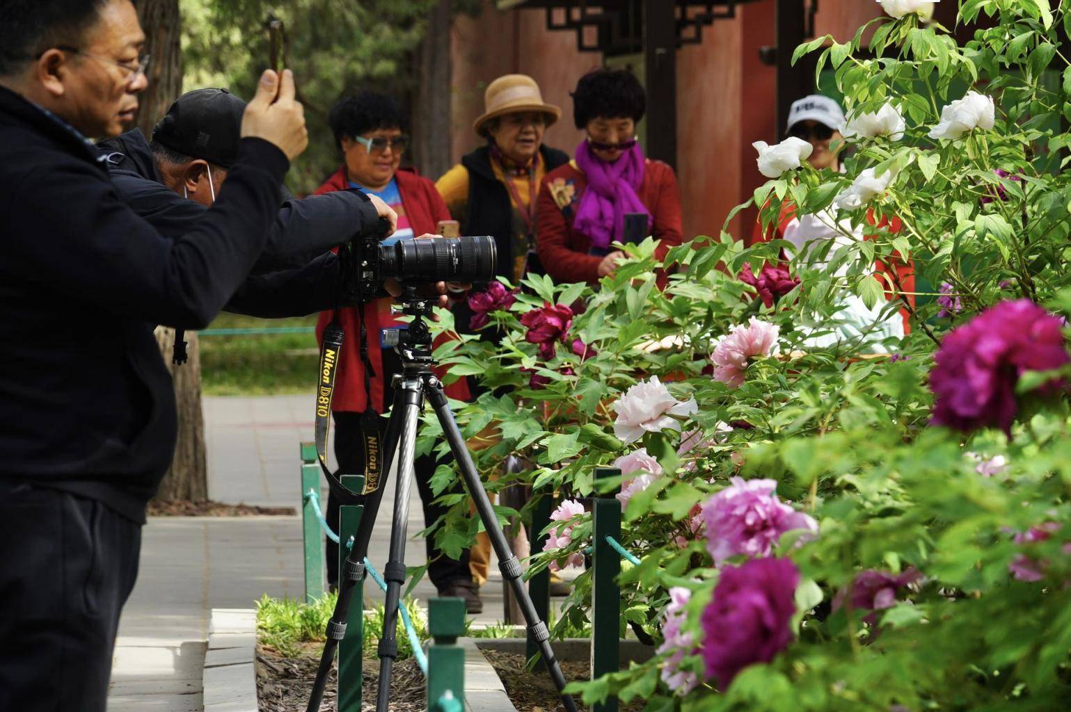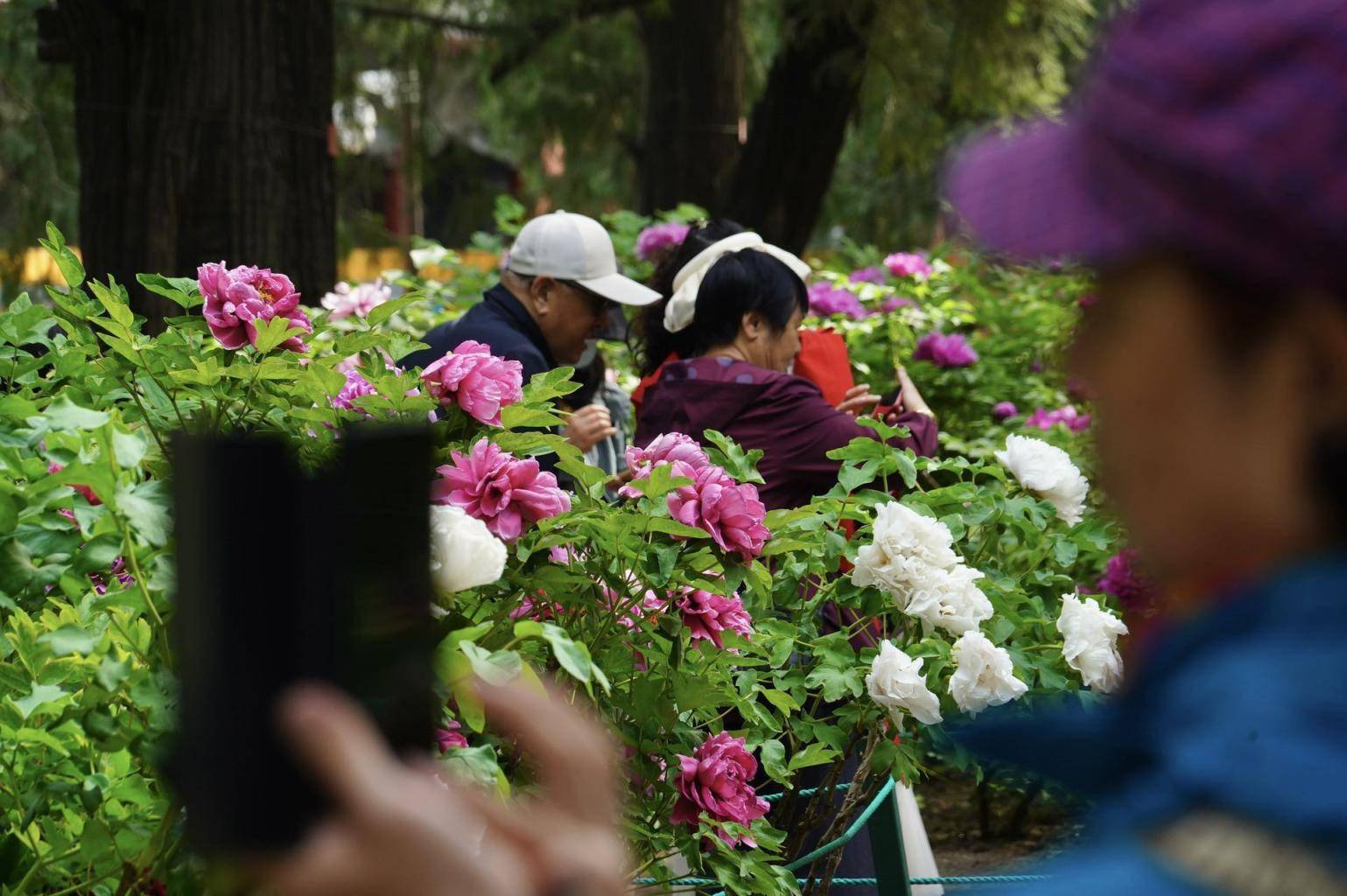 4月17日,伴随着郁金香的绚烂,中山公园南坛门西南侧牡丹进入盛花期,千余株牡丹在青翠的古柏林下竞相开放。
