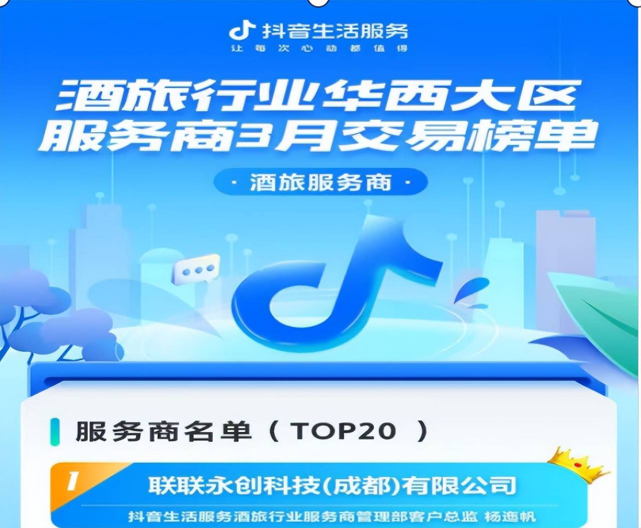 近期抖音发布了《酒旅行业华西大区服务商3月交易榜单》酒旅服务商TOP20榜单,联联集团旗下联联永创科技(成都)有限公司(亦联联周边游)荣膺榜首。得力于公司始终坚持科技创新拥有牢固市场地位,不止到餐业务持续在抖音生态名列前茅,而酒店作为集团业务重点也得到了市场和消费者的高度认可和赞誉。