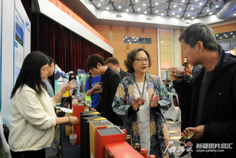 4月16日,2023“优游新疆”高质量创新发展峰会暨旅游产品发布会现场,吐鲁番亿茂酒庄有限公司员工向参会代表推介葡萄酒产品。石榴云/新疆日报记者 秦梅花 摄