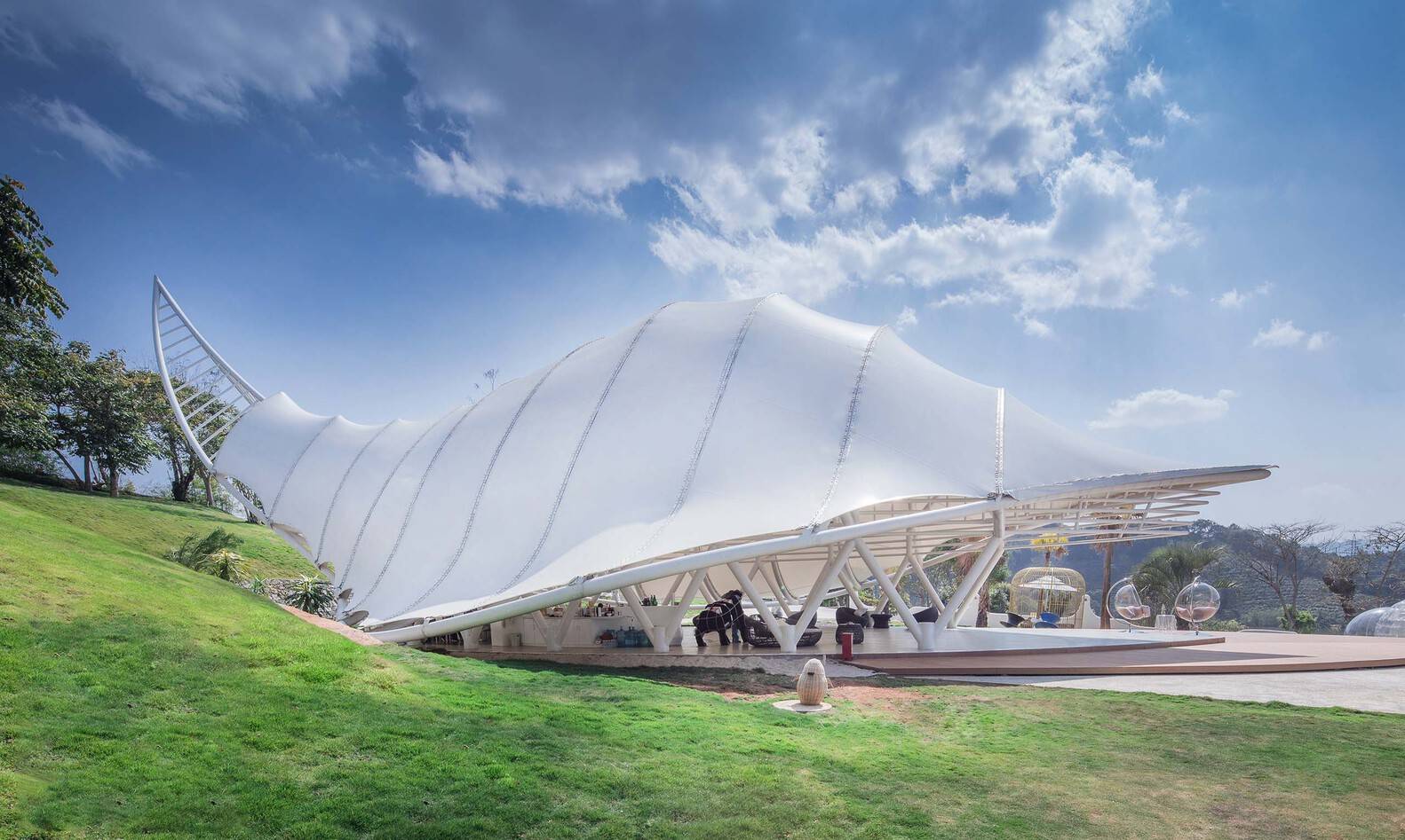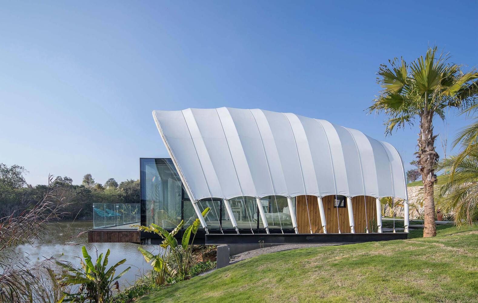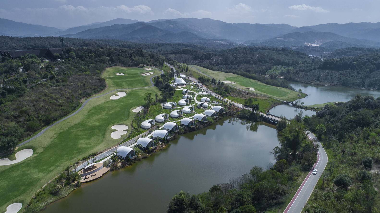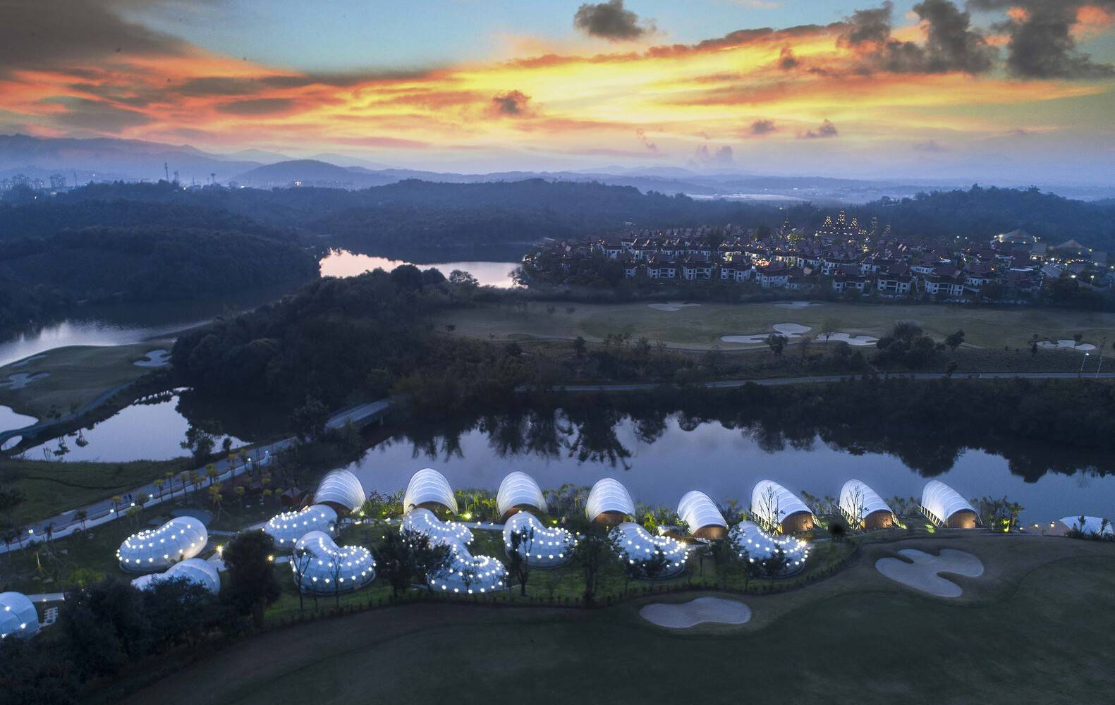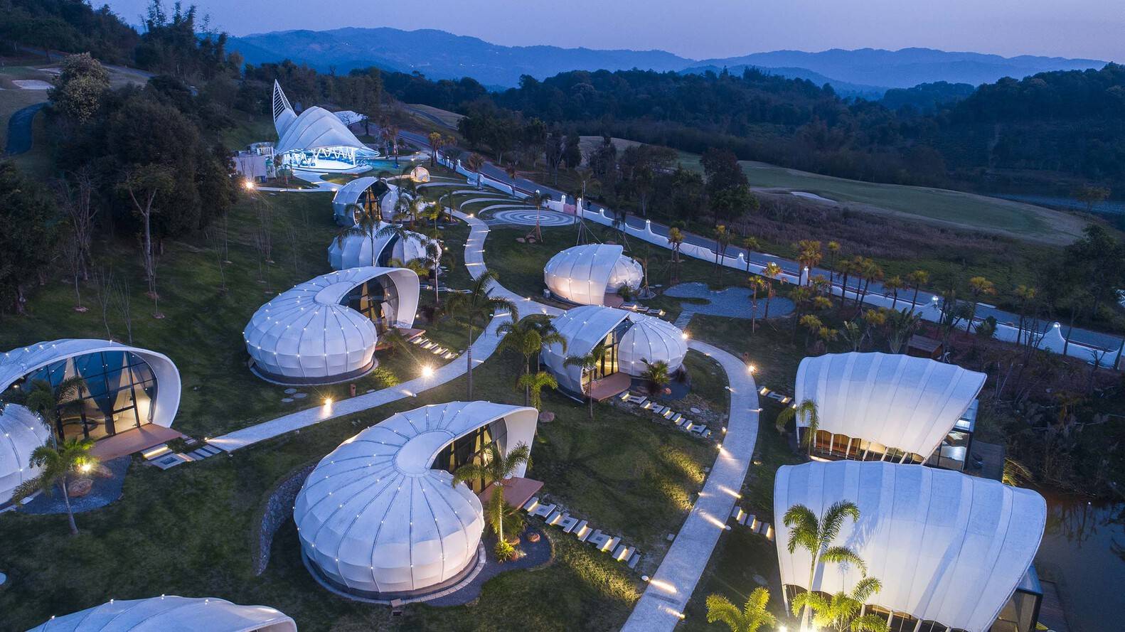 可见泽栖帐篷艺术酒店位于云南省西双版纳傣族自治州景洪市勐海县勐巴拉高尔夫度假区内,紧邻悦椿spa,高尔夫球场。建筑师通过版纳特有的灵动生物幻化成一座座的现代帐篷酒店建筑。酒店落位于水泽岸边,犹如隐在水边的灵性动物泽栖而居。总面积1300㎡,酒店一期为18间客房,分“水映萤火”与“螺中洞天”两个户型。
