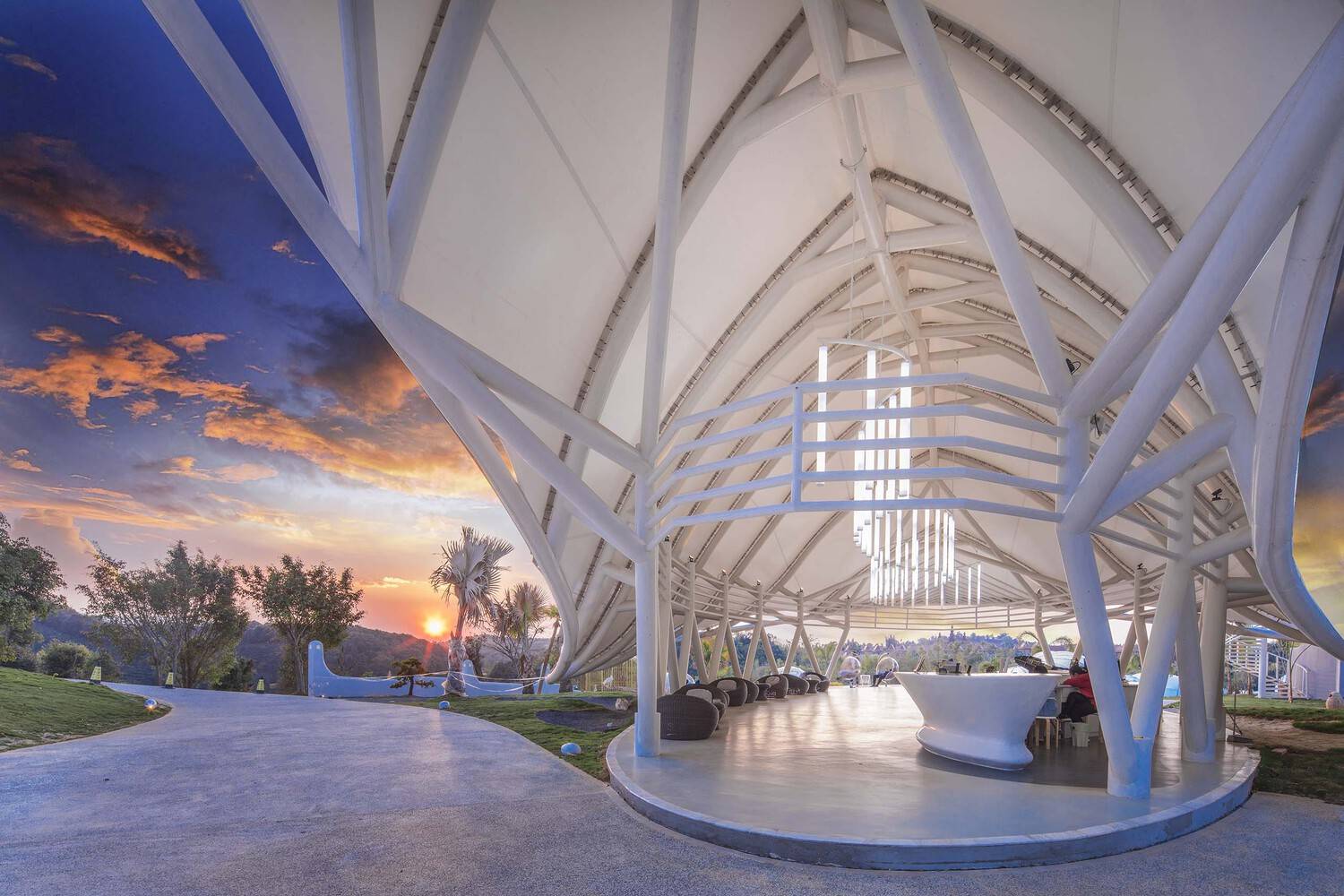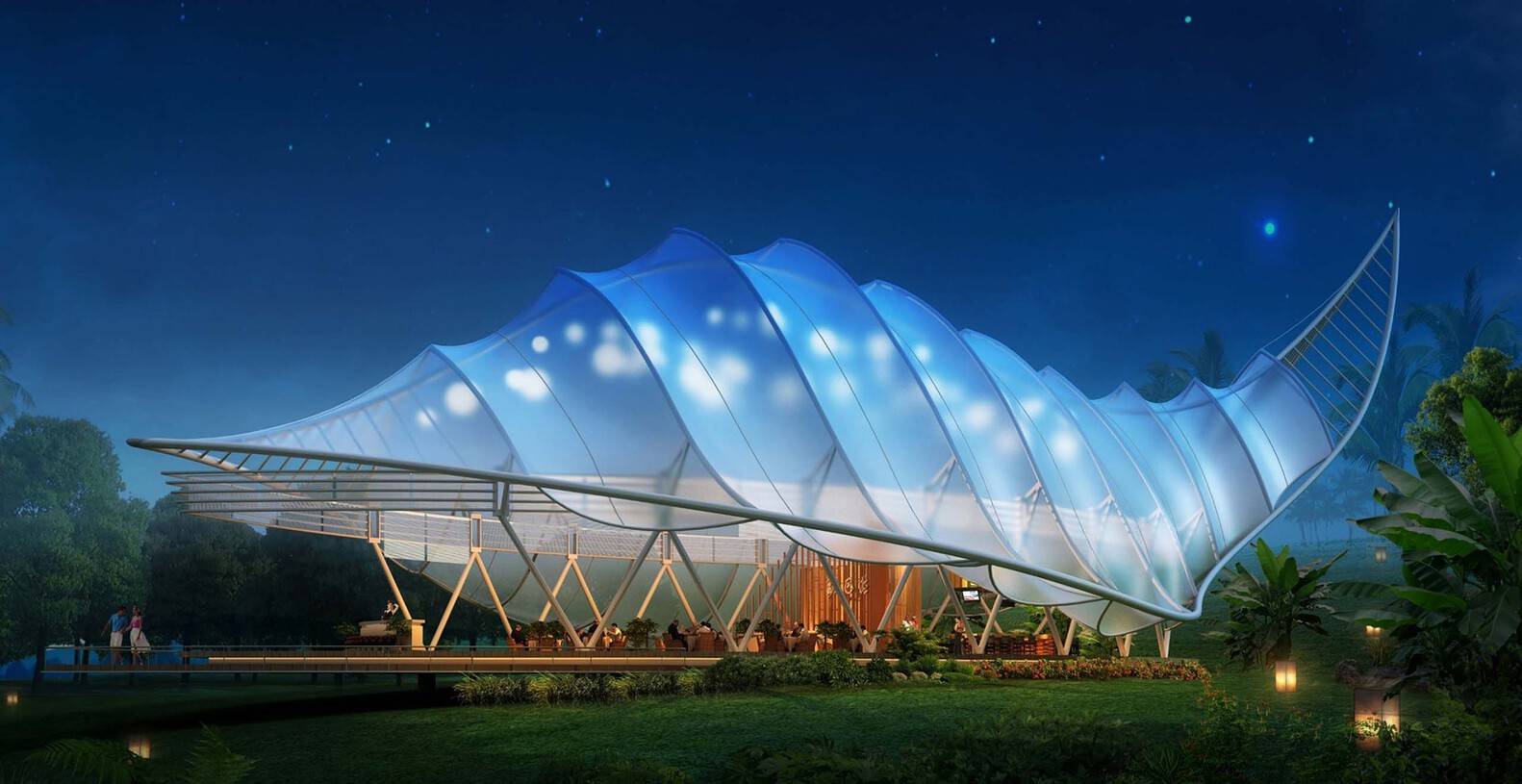 酒店餐厅仿生像形,但不辨其形,似虫,似龙,更显神秘。建筑面积200㎡,设前台、简餐、酒吧。夜宴礼毕,电音骤起,餐厅变酒吧,帐篷之下,流光溢彩。变幻的光彩使建筑有了鲜活心跳。