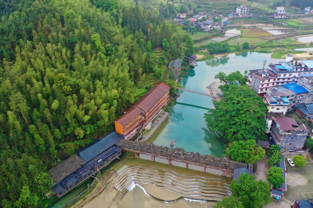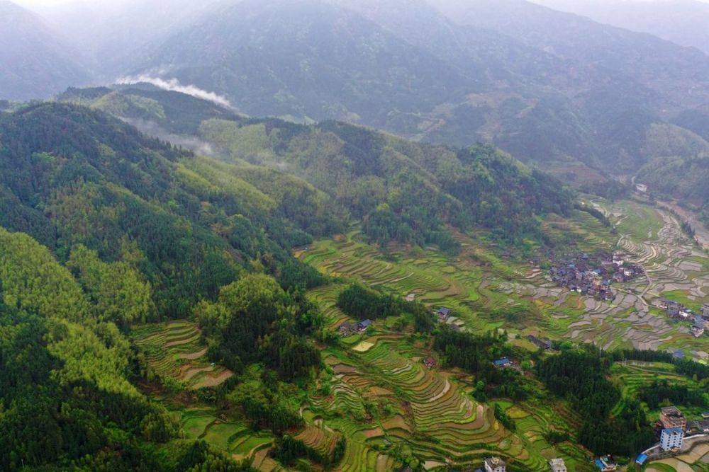 4月15日,在融水苗族自治县香粉乡雨卜苗寨,小河、梯田等构成一幅美丽的春日图景。通讯员 龙林智 摄