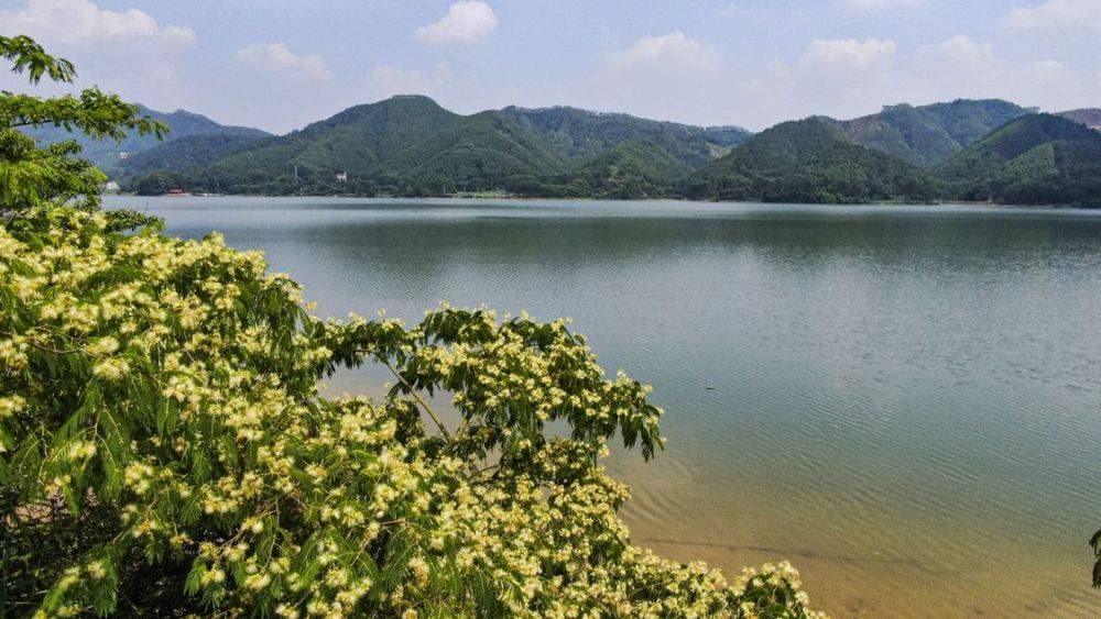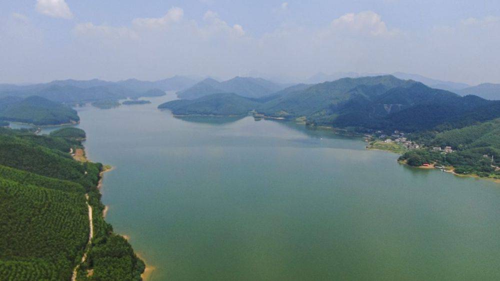 4月16日,在蓝天白云映衬下,俯瞰合浦县曲樟乡六湖水库。通讯员 林启波 摄