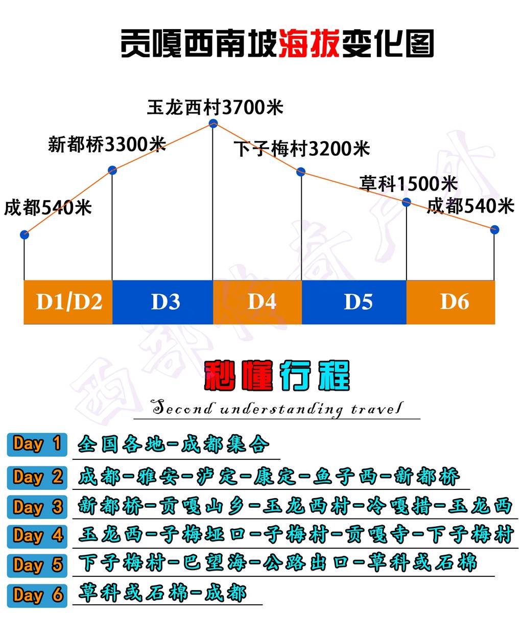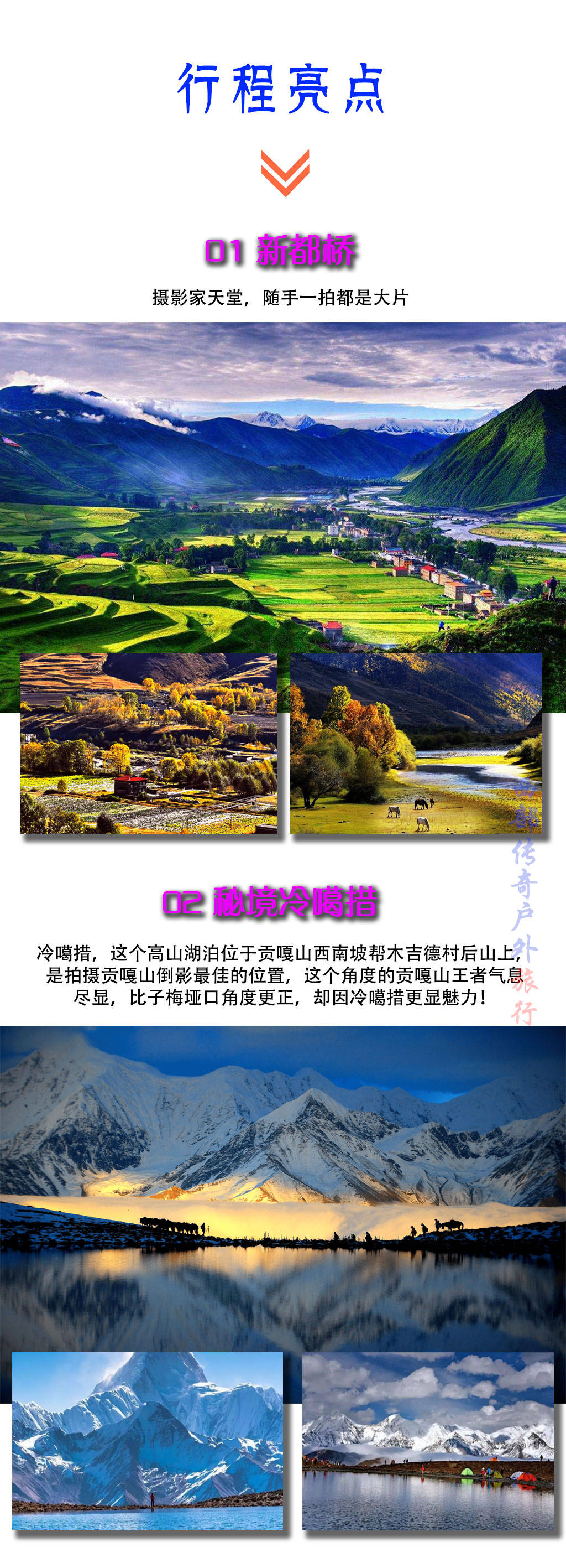 因川西地区雨雪等天气因素,如车辆无法行驶过子梅垭口或巴旺海路段涨水泥石流等自然灾害影响则改为往新都桥返程,行程如下: