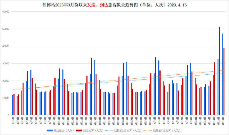 据4月16日最新统计,今年3月份以来,淄博站到发旅客数量呈明显上升趋势,日均到发旅客4万人次。4月15日(周六)到发旅客83635人次,创车站单日到发旅客历史新高,但该记录仅保持一天便被打破。4月16日(周日),淄博站发送旅客47275人次、到达旅客38780人次,合计到发旅客86055人次,发送、到发旅客量均创车站单日历史新高。