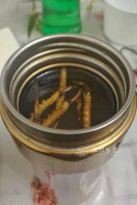 三只虫草解答:这是目前普遍的冬虫夏草泡水方法。关于保温杯泡虫草,虽然不是营养利用最好的,但是确是最实用最方便的一种吃法。这里给大家一个建议:放入冬虫夏草后然后放入刚烧开的开水,盖上盖子,焖3-5分钟之后再喝,味道基本上就出来了。虫草水喝完后可再放开水泡一次,最后把冬虫夏草吃掉。