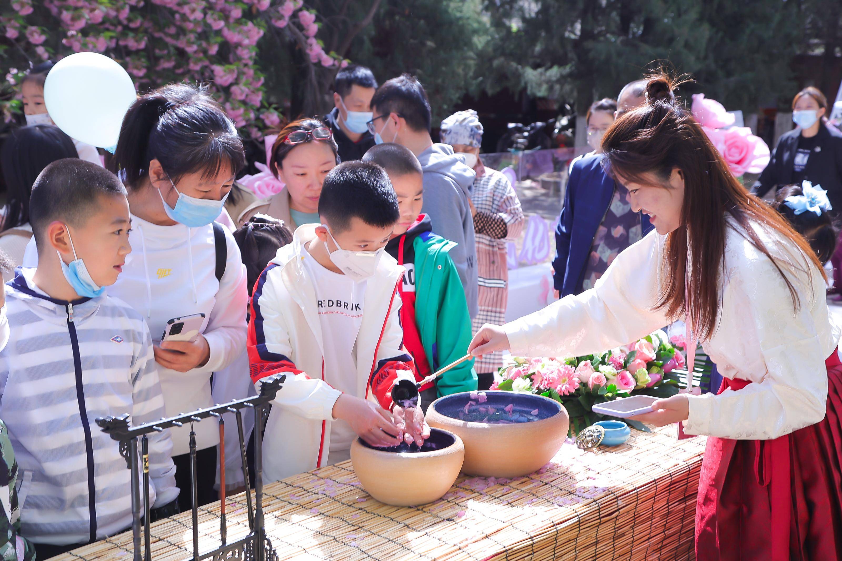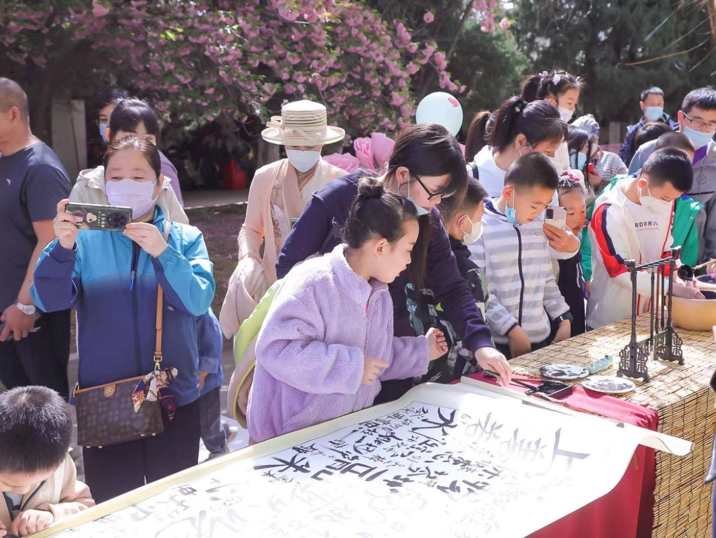 来宾们在赏樱的同时纷纷录制有声明信片“我想对党说”,体验各式手作、风筝制作、DIY团扇制作、汉服秀等。“越罗衫袂迎春风,玉刻麒麟腰带红。”春色花下,飘逸的裙裾、精致的簪花,中华传统服饰之美与绚烂多姿的国潮风交相辉映,在水墨香中感受汉字书法的魅力所在,在诗词之美中,领略诗意人生的写照、家国情怀的寄托,传承诗词文化,涵养民族精神。