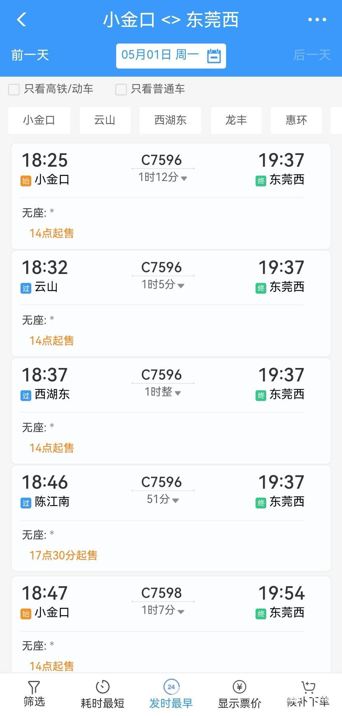 莞惠城际提醒广大旅客朋友,5月1日至5月3日每天非站站停的快线车均有8列,车次分别为C7591、C7592、C7593、C7594、C7595、C7596、C7597、C7598共安排8列,全程最快1小时4分。