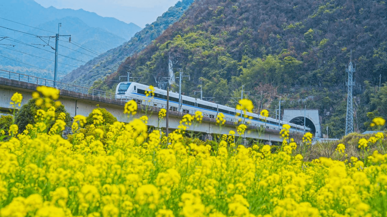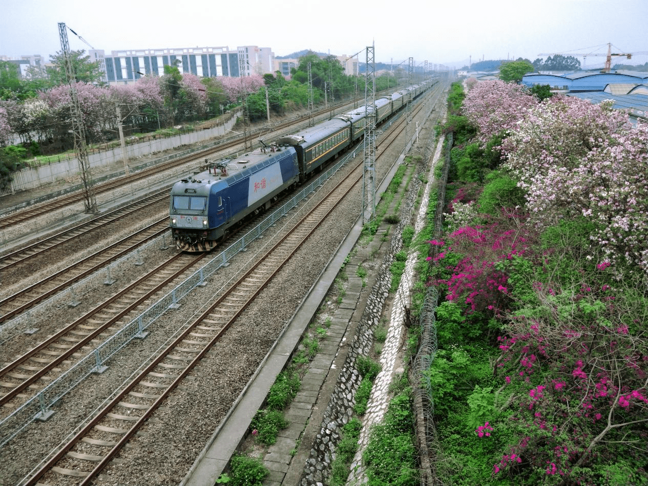 列车行驶在湘桂线的紫荆花海中(央广网发 林诗琪 摄)