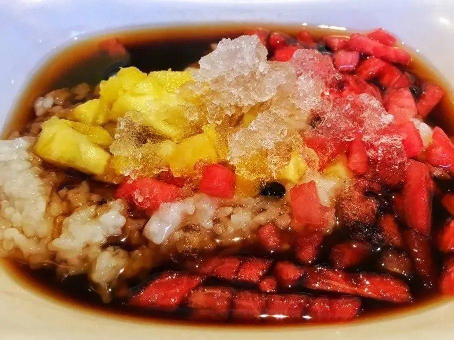 冰稀饭是玉溪人的消暑必备,用糯米熬成粘稠的稀饭,再加入红糖、玫瑰酱、芝麻和花生碎等配料冰镇。吃起来凉入心脾,特别适合配凉米线和炸货。