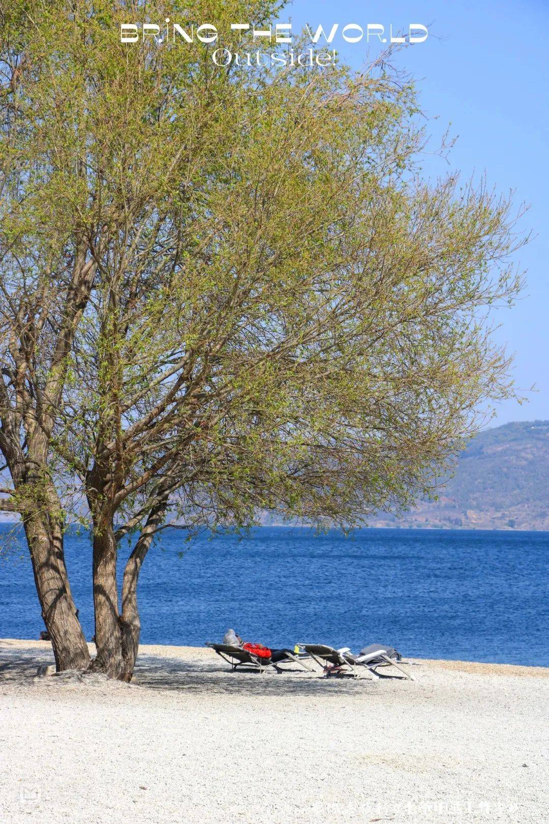 面朝抚仙湖,蓝宝石般的湖面、细软洁白的沙滩和一棵岸边的树,共同组成了这幅浪漫惬意的画面。