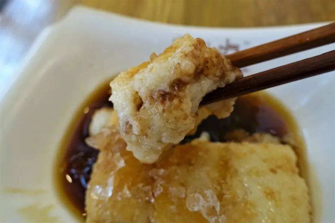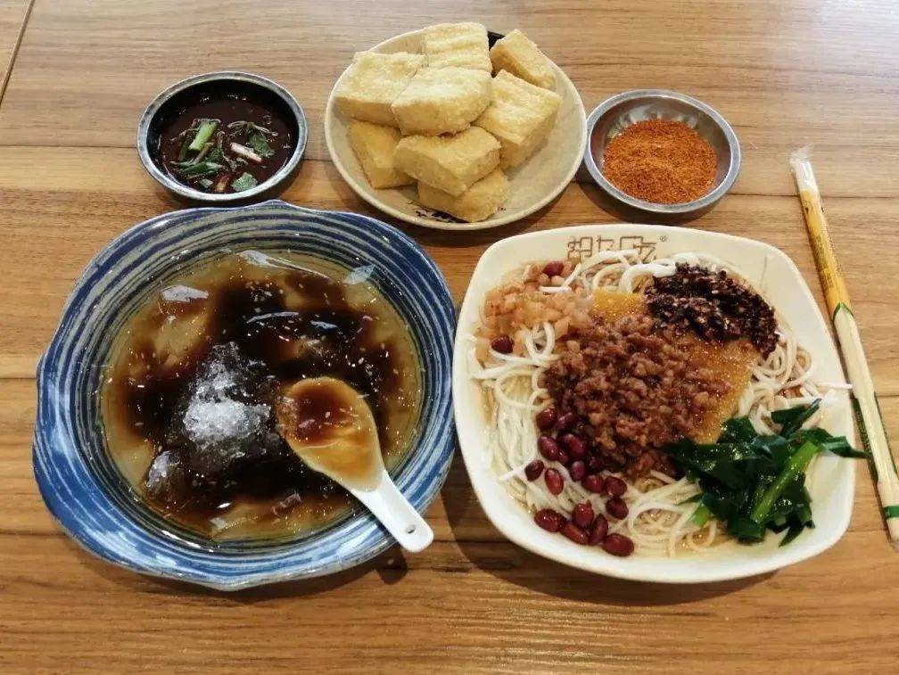 玫瑰凉糕也是一道特色甜品。凉糕用糯米舂捏而成,夹层里有豆沙和玫瑰,吃时切成小方块,再配上红糖水、白芝麻和红绿丝,吃起来糯叽叽、甜丝丝。